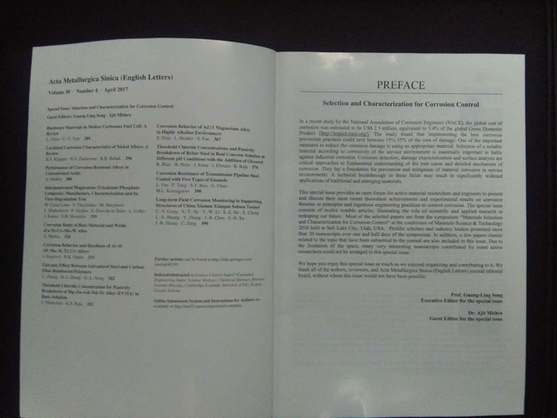 宋光铃教授为Acta Metallurgica Sinica (English Letters) 杂志主编的腐蚀特刊正式出刊。(2017-04-27)